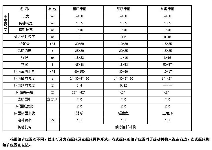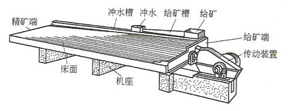 矿用摇床选矿过程是在具有来复条的倾斜台面上进行的,矿粒群从台面上角的给矿槽送入,同时由给水槽供给横向冲洗水,在振动波作用下,按比重和粒度分层,并沿台面作纵向运动和横向运动.比重和粒度不同的矿粒沿着各自的运动方向呈梯形流下,分别从精矿端和尾矿侧的不同位置排出,最后被分成精矿、中矿和尾矿。6—S型摇床是一种物理选矿设备,它主要用于选别金、银、铅锌、钽铌、锡等稀有金属和贵重金属矿石。