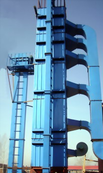 顺流粮食烘干机多为漏斗式进气道与角状盒排气道相结合的塔式结构,它不同于混流烘干机由一个主风管供热风,而是由多个(级)热风管供给不同或部分相同的热风。国内生产厂家数量少于混流烘干机厂家,顺流粮食烘干机优点:(1)使用热风温度高,一般一级高温段温度可达150~250℃;(2)单位热耗低,能保证烘后粮食品质;(3)三级顺流以上的烘干机具有降大水份的优势,并能获得较高的生产率;(4)连续烘干时一次降水幅度大,一般可达10%~15%;(5)最适合烘干大水份的粮食作物和种子。顺流粮食烘干机缺点是:(1)结构比较复杂,制造成本接近或略高于混流烘干机;(2)粮层厚度大,所需高压风机功率大,价格高。